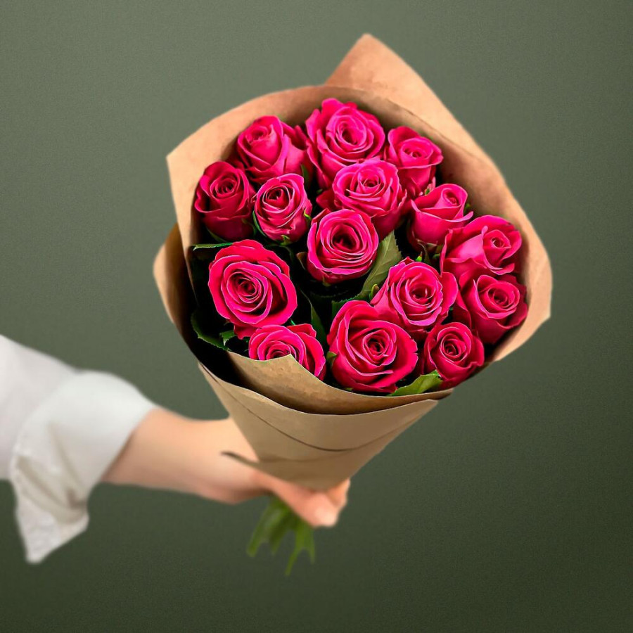 На фото букет из 11 малиновых роз. В составе: роза 11 шт, крафт-бумага 1 шт, атласная лента 1 шт, . Все цветы свежие и ароматные, букет красиво оформлен и отлично подходит для подарка. Доступна доставка цветов или самовывоз.