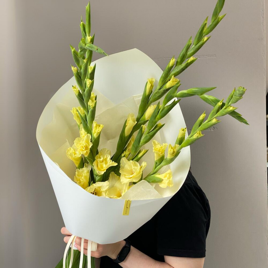 Лента - 3 шт. Тишью - 1 шт. Упаковка дизайнерская - 1 шт. Гладиолус желтый - 5 шт.