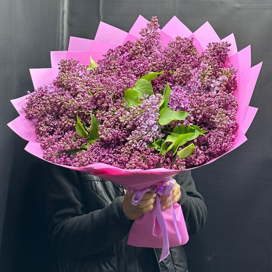 На фото огромный букет из сирени. В составе: сирень 29 шт, дизайнерская упаковка 4 шт, атласная лента 1 шт, . Все цветы свежие и ароматные, букет красиво оформлен и отлично подходит для подарка. Доступна доставка цветов или самовывоз.